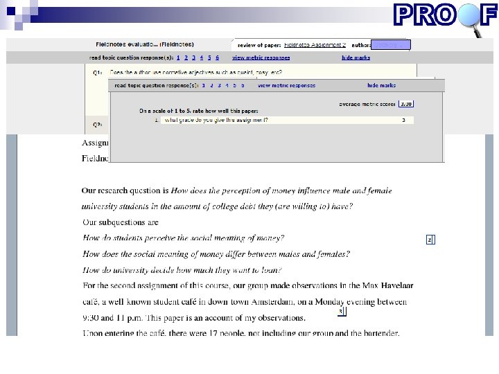 Voorbeeld 2 (Annotatiesysteem) n n www. annotatiesysteem. nl Wat, waarom, hoe van peer review. . n n n Formatief Schrijfproduct Groepen van 3 Niet-anoniem Criteriageleide kwalitatieve feedback Demonstratie annotatiesysteem in cursus BMW http: //www. annotatiesysteem. nl/index. php? m= document. view&id=1578