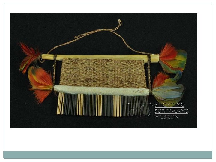 Peigne wayana - SSM-0049 -03 Lieu de conservation : Stichting Surinaams Museum Artiste : Inconnu Groupe culturel : Wayana Appellation vernaculaire : Origine géographique : Suriname Période de fabrication : 1992 Matériau : Bois, coton, plume, os Technique de fabrication : inconnu Dimensions : Hauteur : 17 cm ; Largeur : 8 cm Date de collecte : 1992