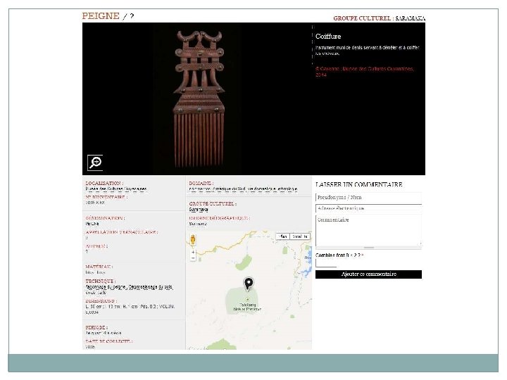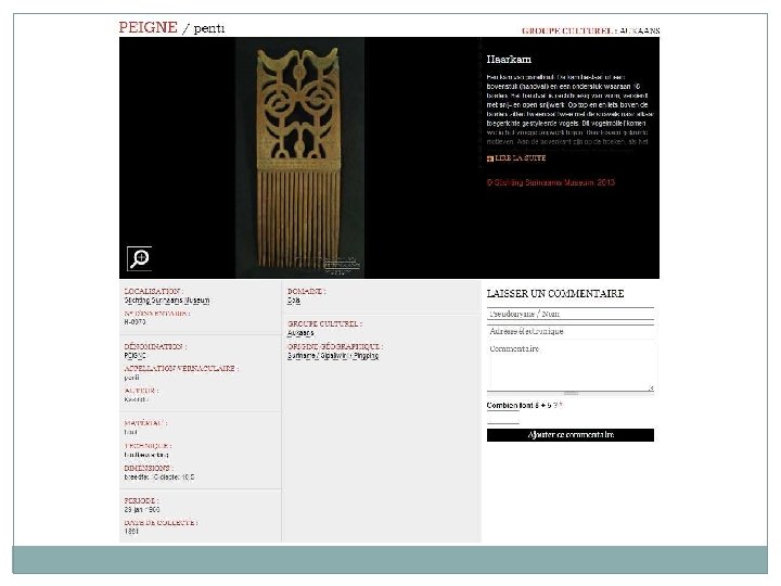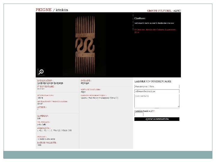 Proposition d’activité – Niveau fin collège – Lycée (Activité HDA / B 2 I) 1/ Rendez vous sur le site Amazonian Museum Network AMN) à l’adresse suivante : http: //amazonian museum network. org/fr/les collections Dans la boite de dialogue, inscrivez le mot « peigne » . Choisissez un peigne parmi ceux qui vous sont proposés. 2/ A partir des renseignements de la notice du site AMN, complétez la fiche ci dessous (ce que vous pouvez compléter) Lieu de conservation : Artiste : Groupe culturel : Appellation vernaculaire : Origine géographique : Période de fabrication : Matériau : Technique de fabrication : Dimensions : Hauteur : Largeur : Profondeur : Date de collecte : 3/ Décrivez en quelques lignes le peigne choisi et son décor. 4/ A partir des sites internet (notamment wikipedia), présentez le groupe culturel d’où est issu le peigne que vous avez choisi : historique, localisation géographique, techniques artisanales. Vous pouvez vous aider aussi du DVD du musée des cultures guyanaises, en partiuclier de l’exposition « les arts des Marrons » . 5/ A partir des documents proposés en annexe (pages 30, 31, 32), expliquez la fonction de ces peignes dans le groupe culturel d’où ils sont issus. Si vous le pouvez, essayez d’expliquer les symboles qui composent le décor. 6/ Sur la page des collections en ligne du musée du quai Branly : http: //collections. quaibranly. fr/, inscrivez le mot « peigne » dans la boite de dialogue « recher » . Décochez « Iconothèque » pour limiter la recherche aux objets. Dans les résultats qui s’affichent, trouvez un peigne qui se rapproche de celui étudié et décrivez le brièvement en n’oubliant pas de préciser son origine ethnique et géographique. 7/ Donnez votre avis personnel sur le peigne étudié. Ce travail peut être présenté sous forme numérique (présentation, traitement de texte) et comporter des images