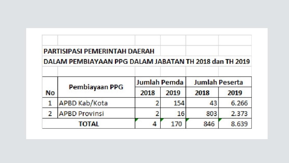 LPTK PENYELENGGARA PPG DALJAB NO NAMA LPTK 1 Universitas Syiah Kuala 2 Universitas Negeri Medan KUOTA PESERTA 1. 124 NO NAMA LPTK 16 Universitas Lambung Mangkurat KUOTA PESERTA 1. 163 2. 706 17 Universitas Palangkaraya 645 3 Universitas Bengkulu 727 18 Universitas Mulawarman 908 4 Universitas Sriwijaya 696 19 Universitas Tanjungpura 897 5 Universitas Riau 522 20 Universitas Pendidikan Ganesha 6 Universitas Negeri Padang 7 Universitas Lampung 1. 842 836 1. 031 21 Universitas Mataram 479 22 Universitas Nusa Cendana 878 8 Universitas Negeri Jakarta 1. 506 23 Universitas Negeri Makassar 9 Universitas Pendidikan Indonesia 4. 067 24 Universitas Tadulako 468 10 Universitas Negeri Yogyakarta 3. 598 25 Universitas Halu Oleo 336 11 Universitas Negeri Semarang 1. 452 26 Universitas Negeri Manado 568 12 Universitas Sebelas Maret 1. 512 27 Universitas Negeri Gorontalo 291 13 Universitas Negeri Surabaya 2. 078 28 Universitas Pattimura 323 14 Universitas Negeri Malang 2. 436 29 Universitas Khairun Ternate 164 30 Universitas Cenderawasih 307 15 Universitas Jember 599 2. 609