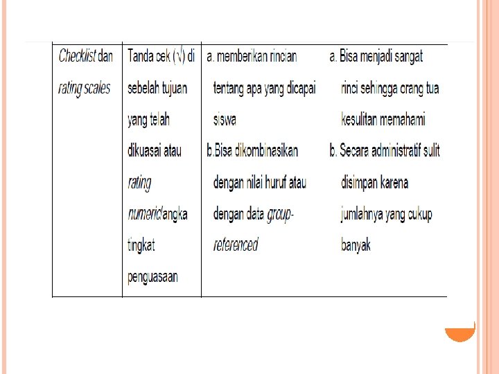 Laporan Naratif yang Dimodifikasi Laporan naratif yang dibuat rinci dan bermakna memakan sangat banyak waktu bagi guru untuk mempersiapkannya. Berangkat dari kenyataan tersebut, kita bisa memodifikasi proses pelaporan, salah satunya adalah dengan cara mengkombinasikan prosedur checklist atau rating scale dengan komentar tertulis yang singkat mengenai masing peserta didik.