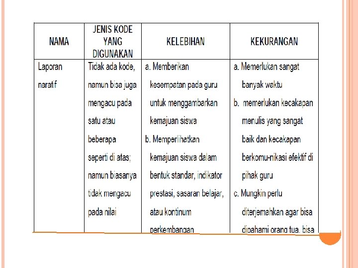Kedua hal yang disebutkan terakhir itu rasanya tidak akan muncul pada bentuk laporan yang standardized (Power & Chandler, 1998). Kelebihan laporan naratif yang lain adalah terkait dengan konsep pemberian deskripsi yang komprehensif mengenai belajar dan perkembangan peserta didik.