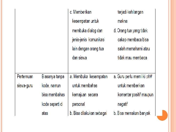b. Pengetahuan yang diperoleh dari laporan akan menciptakan hubungan yang baik antara orang tua dan guru. c. Komunikasi yang baik antara orang tua dan guru akan menghasilkan perbaikan-perbaikan dalam belajar dan sikap (Gibson, 1986 dalam Conner, 1991).