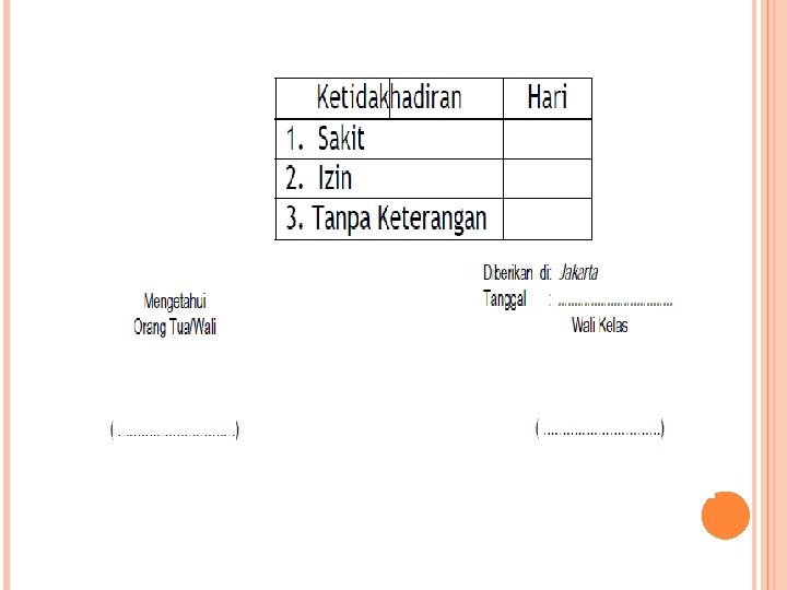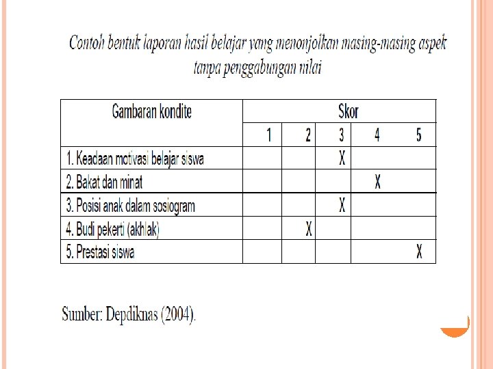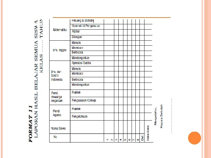 Oleh karena itu laporan tersebut merupakan hasil belajar yang bersifat akademik (raport) serta hasil belajar non akademik yang berbentuk kualitatif. Karena laporan jenis ini merupakan laporan hasil belajar komulatif, maka dalam membuatnya wali kelas menggunakan laporan setiap guru mata pelajaran sebagai sumbernya (Lihat Format 10).