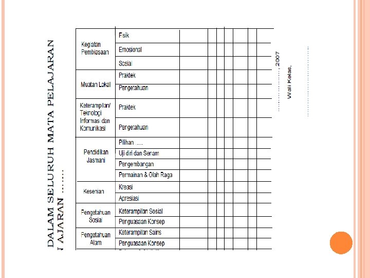 Dalam format tersebut guru cukup membubuhkan tanda silang dalam kolom nilai yang sudah disediakan. Cara pengisiannya hanya memberikan tanda centang (V) pada masing-masing aktivitas (emosional, fisik dan sosial) dalam kolom yang telah disediakan. 4. Laporan Hasil Belajar Siswa oleh Wali Kelas Tidak seperti laporan yang dibuat oleh guru mata pelajaran, laporan hasil belajar siswa yang dibuat oleh wali kelas lebih menekankan pada ketercapaian siswa dalam kemampuan yang ditetapkan dari seluruh mata pelajaran yang telah ditempuh siswa.