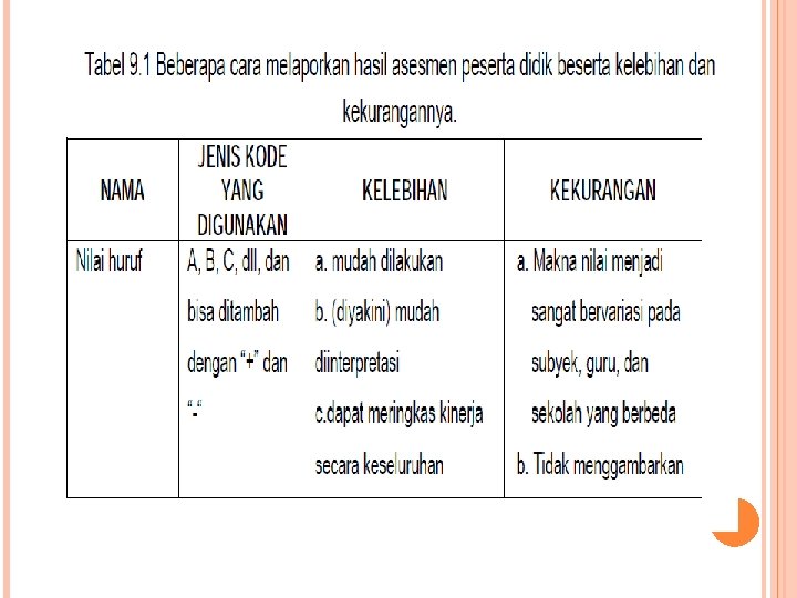 4. Langkah-langkah Melaporkan Hasil Asesmen Banyak metode yang dapat dipergunakan untuk melaporkan kemajuan peserta didik kepada peserta didik sendiri maupun kepada para orang tua. Proses mengkomunikasikan hasil evaluasi ini tidak boleh dianggap remeh, bahkan merupakan komponen yang sangat mendasar dari sebuah model evaluasi yang baik.