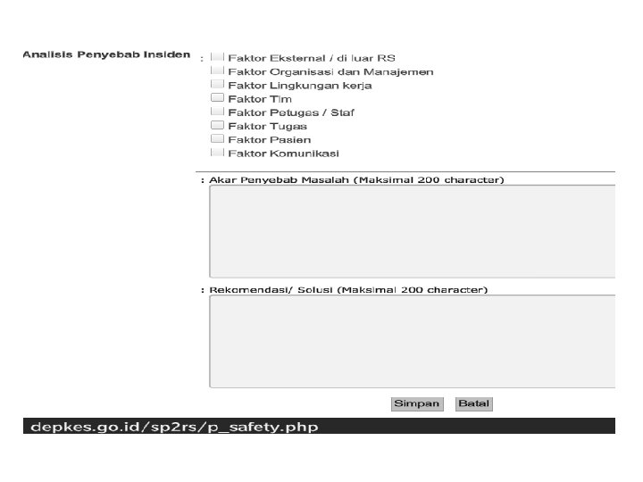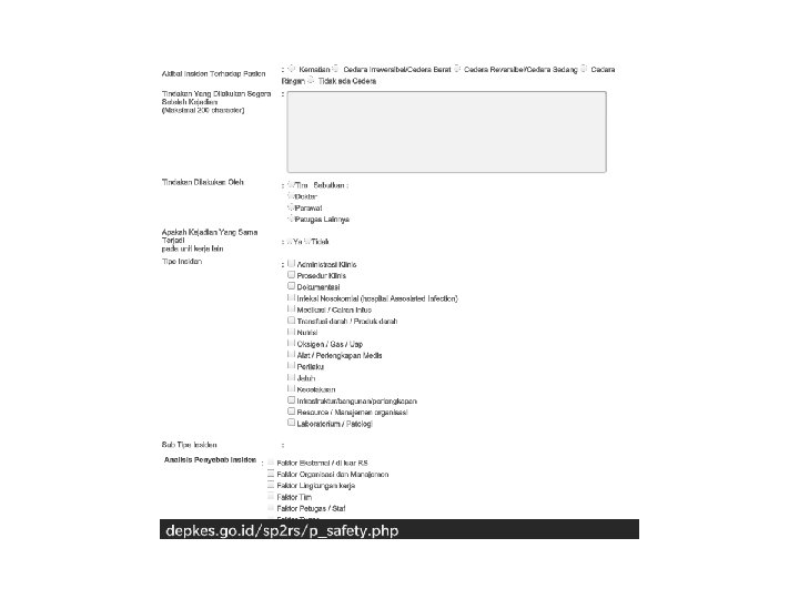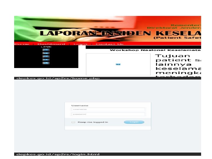 Laporan Insiden Eksternal (panduan e-report) • Akses website KKPRS yaitu : http: //www. buk. depkes. go. id • Klik Banner Patient Safety • Setelah tampilan terdapat 2 isian yang harus diperhatikan yaitu: username dan password – Username yaitu kode Registrasi RS – Password yaitu password yang diberikan oleh Kementerian Kesehatan (RS dapat mengajukan permintaan pw dengan surat resmi ke Kemkes) • Entry Data