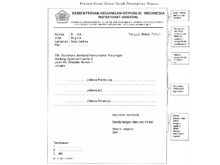 Surat Dinas. . . (3) ditandatangani oleh pejabat sesuai dengan tugas, fungsi, wewenang. Susunan Surat Dinas: a. Kepala Surat Dinas b. Batang Tubuh Surat Dinas c. Kaki Surat Dinas Hal yang Perlu Diperhatikan: 1. Kepala surat hanya digunakan pada halaman pertama; 2. Jika surat dinas disertai dengan lampiran, disertakan keterangan jumlah lampirannya; 3. Hal berisi pokok surat sesingkat mungkin, ditulis dengan huruf awal kapital pada setiap unsurnya, tanpa tanda baca. 4. Alamat Menteri Keuangan pada surat Menteri Keuangan diletakkan pada bagian bawah halaman terakhir. Integritas – Profesionalisme – Sinergi – Pelayanan –