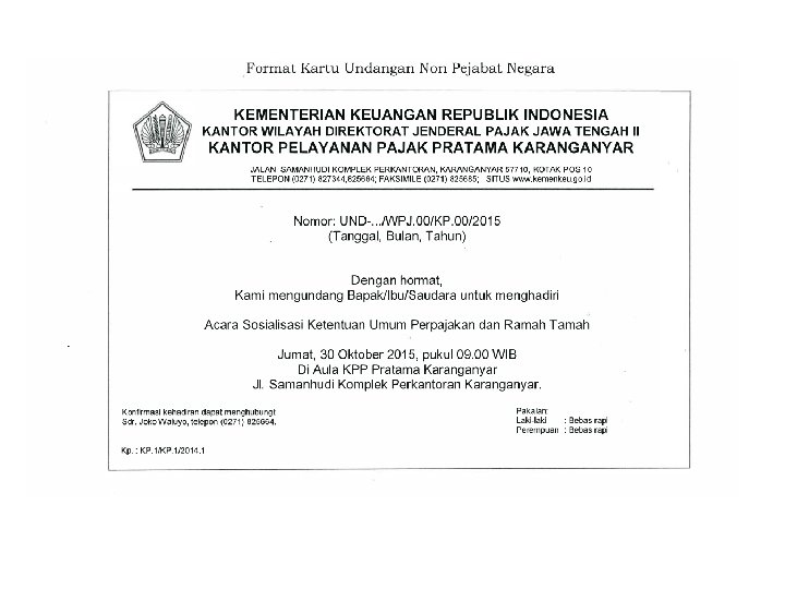 Undangan. . . (2) Susunan Surat Undangan: a. Kepala Surat Undangan b. Batang Tubuh Surat Undangan c. Kaki Surat Undangan Hal yang Perlu Diperhatikan: 1. Surat undangan untuk keperluan tertentu dapat berbentuk kartu dengan ukuran 19 ½ cm x 14 ½ cm. 2. Apabila diperlukan, dapat mencantumkan nama dan nomor kontak pejabat/pegawai yang dapat dimintai informasi terkait dengan acara tersebut. Integritas – Profesionalisme – Sinergi – Pelayanan –