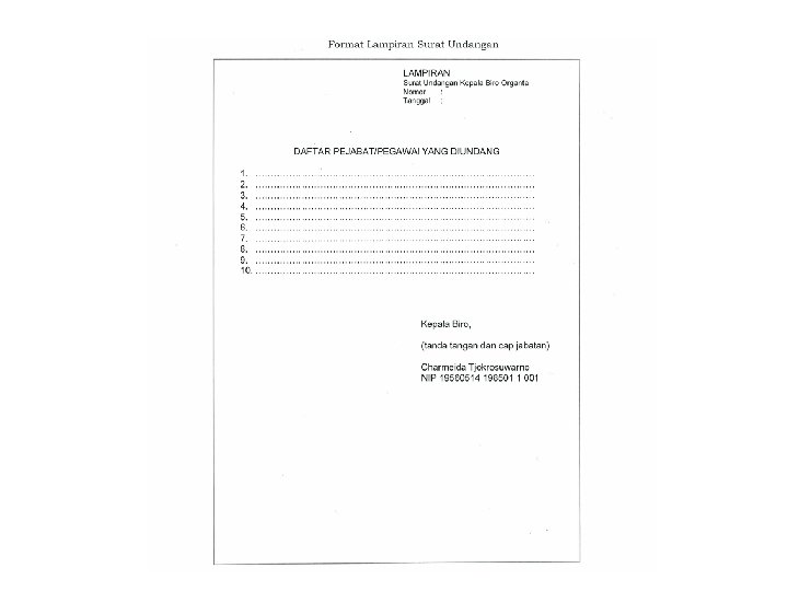 Contoh Ruang Tanda Tangan • Pada naskah dinas yang ditandatangani atas nama a. n. Sekretaris Jenderal Kepala Biro Organisasi dan Ketatalaksanaan (tanda tangan) Carmeida Tjokrosuwarno NIP 19560514 198501 1 001 • Pada naskah dinas yang ditandatangani untuk beliau Sekretaris Jenderal u. b. Kepala Biro Organisasi dan Ketatalaksanaan (tanda tangan) Carmeida Tjokrosuwarno NIP 19560514 198501 1 001 Integritas – Profesionalisme – Sinergi – Pelayanan –
