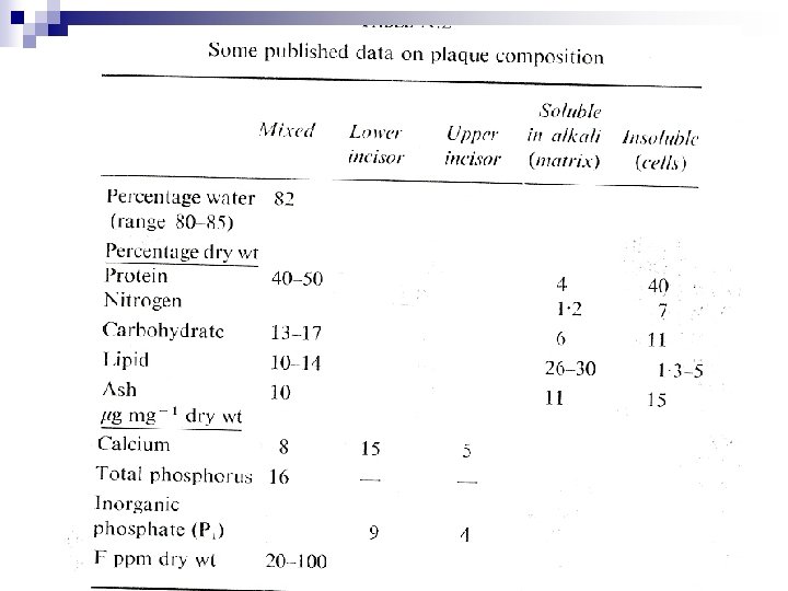 Composition of Plaque A- Matrix • • • B- Bacteria Composition vary from different areas Two fractions-Water sol. and Water insol. 80 -85% water (mean 82% of wet weight, 50% in cells & 32% in matrix)