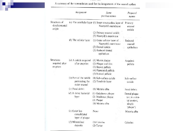 Pellicle A layer directly on top of enamel 1 -3μm thick (could reach 10 μm), free from bacteria, and is not removed by a tooth brush, but can be removed by a “prophylaxis”, or scale and polish, with abrasive paste