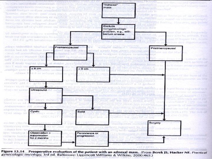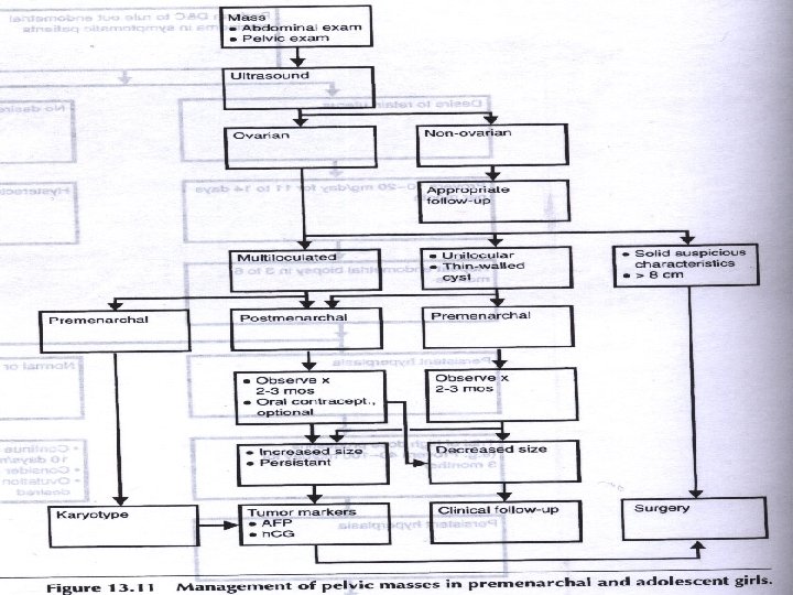 Ovarian masses in adolescent age group • Likelihood of functional masses increases after menarche • The risk of malignant neoplasms is lower among adolescents than among young children. • Epithelial neoplasms occur with increase frequency with age. • Germ cell tumors are the most common tumors of the first decade of life but occur less frequently during adolescence. • Mature cystic teratuma is the most frequent neoplastic of children and adolescents accounting for more than 1/2 of ovarian neoplasms in women younger than 20 years of age.