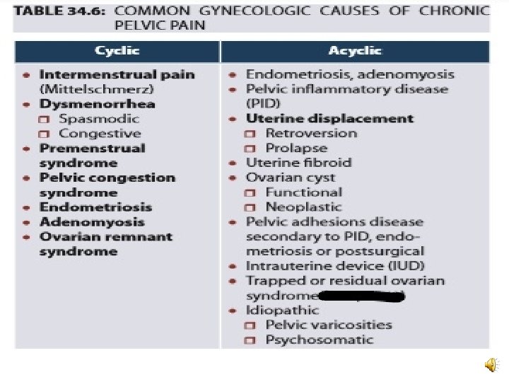 Cause of acute pelvic pain mechanism Clinical condition Hemoperitoneum – peritoneal irritation Disturbed tubal pregnancy Ruptured chocolate cyst Ruptured corpus luteum or follicular cyst Infection – peritoneal irritation Acute PID, tubo-ovarian abscess Chemical irritation Following HSG Uterine cramp Abortion, dysmenorrhea Vascular complication with neurologic Involvement Axial rotation of ovarian tumor pedicle Visceral distension Intracystic hemorrhage Hyperstimulation syndrome Hematometra or pyometra Non-gynecological Appendicitis UTI, pyelonephritis, renal calculus Intestinal obstruction Rectus sheath hematoma