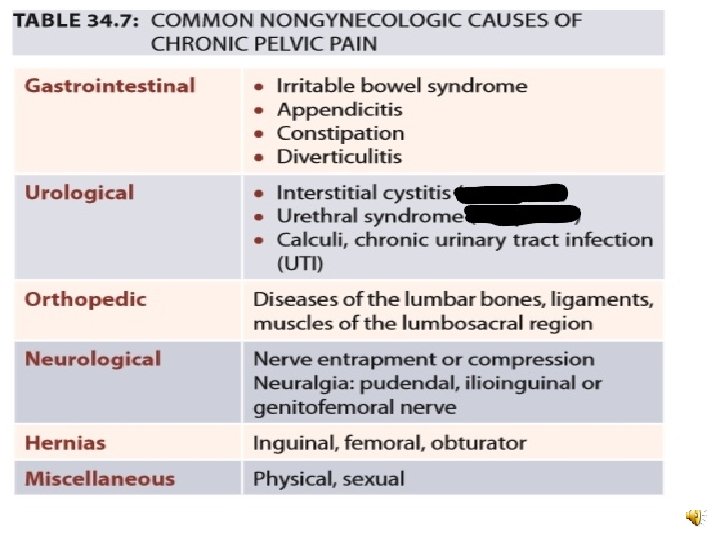 • Transcutaneous electric nerve stimulation (TENS) : - Inhibit the transmissioin of nerve impulse via unmyelinated fibers. • Pain mapping is useful specially in assessment of adhesions. • Nongynecological disorders mostly related with disorders of bowel (spastic colon, irritable bowel syndrome). • Spasm or rigidity of muscles specially those of vertebral column suggests orthopedic, neurologic or rheumatic lesion.
