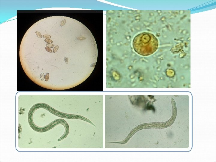 PEM MIKROSKOPIK Pemeriksaan protozoa, telur cacing, leukosit, eritosit, sel epitel, kristal, makrofag dan sel ragi. Terpenting : pemeriksaan protozoa dan telur cacing. Protozoa biasanya dalam bentuk kista, bila konsistensi feses cair, didapatkan bentuk trofozoit. Telur cacing = Ascaris lumbricoides, Necator americanus, Enterobius vermicularis, Trichuris trichiura, Strongyloides stercoralis dll.