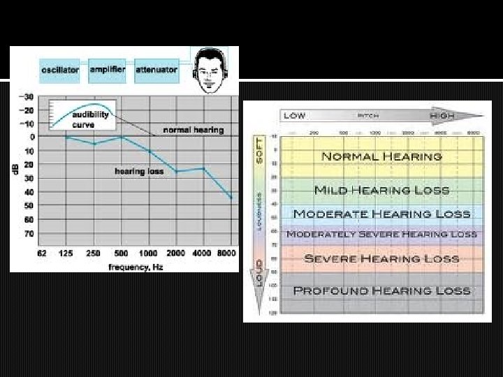 4. Audiometri � Tujuan : untuk menentukan sifat kelainan pendengaran � Merupakan earphone sederhana yang dihubungkan dengan ossilator elektronik yang mampu memancarkan suara murni dengan kisaran frekuensi rendah tinggi � Tingkat intensitas nol pada masing 2 frekuensi adalah kekerasan yang hampir tidak bisa didengar oleh telinga normal � Volume dapat ditingkatkan, bika harus ditingkatkan hingga 30 desibel dari normal org tsb dikatakan kehilangan pendengaran 30 d. B untuk frekuensi tertentu