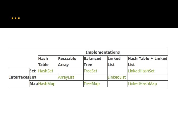. . . Pada dasarnya ada 3 Interface yang digunakan, yaitu Set, List, dan Map. Kemudian ada 5 implementasi dasar yang digunakan pula, yaitu Hash Table, Resizable Array, Balanced Tree, Linked List, dan Hash Table + Linked List.