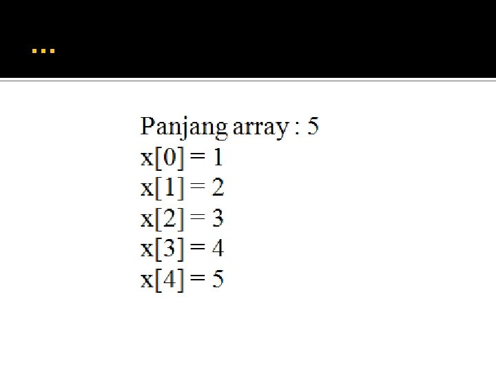. . . Cara memberikan nilai pada array: Contoh: int[] nim = new int[3]; nim[0]=1; nim[1]=2; nim[2]=3;