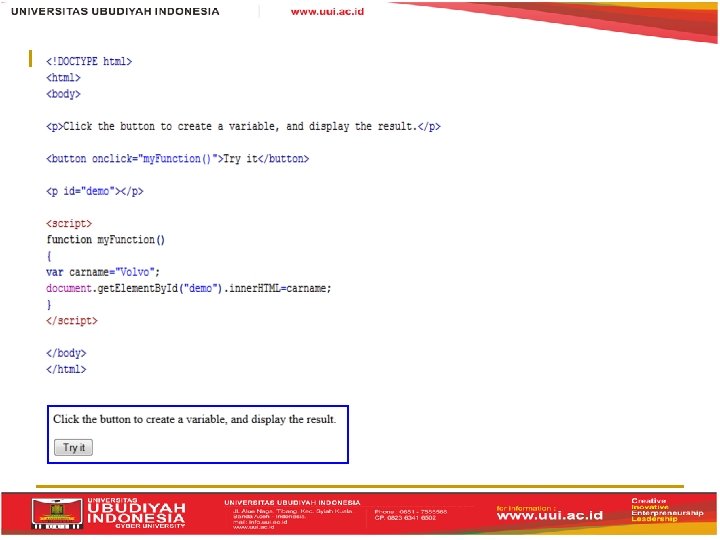 Local Java. Script Variables A variable declared (using var) within a Java. Script function becomes LOCAL and can only be accessed from within that function. (the variable has local scope). You can have local variables with the same name in different functions, because local variables are only recognized by the function in which they are declared. Local variables are deleted as soon as the function is completed. Global Java. Script Variables declared outside a function, become GLOBAL, and all scripts and functions on the web page can access it.