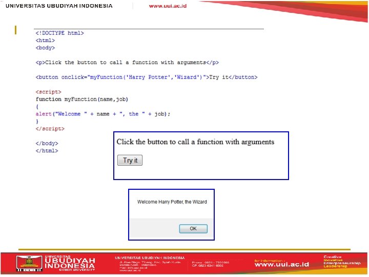 Calling a Function with Arguments When you call a function, you can pass along some values to it, these values are called arguments or parameters. These arguments can be used inside the function. You can send as many arguments as you like, separated by commas (, ) Syntax: my. Function(argument 1, argument 2) Declare the argument, as variables, when you declare the function: function my. Function(var 1, var 2) { some code }