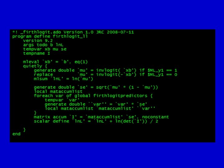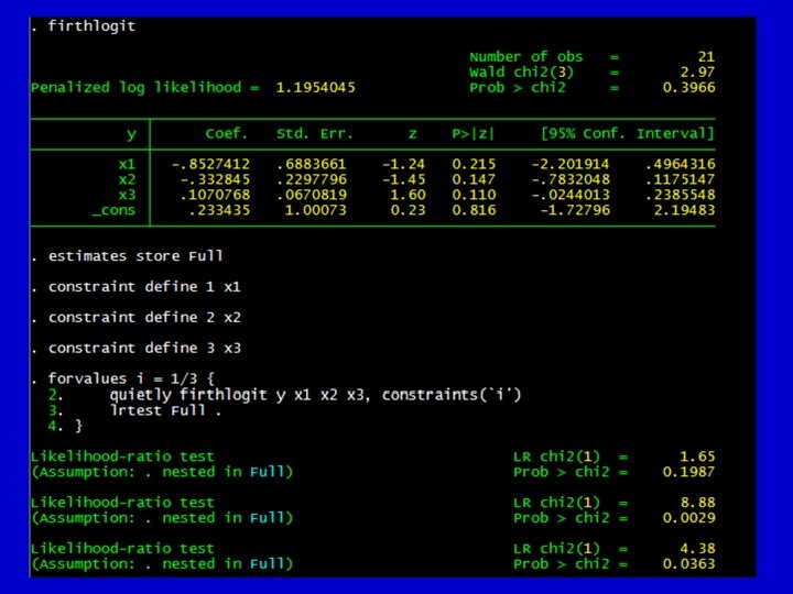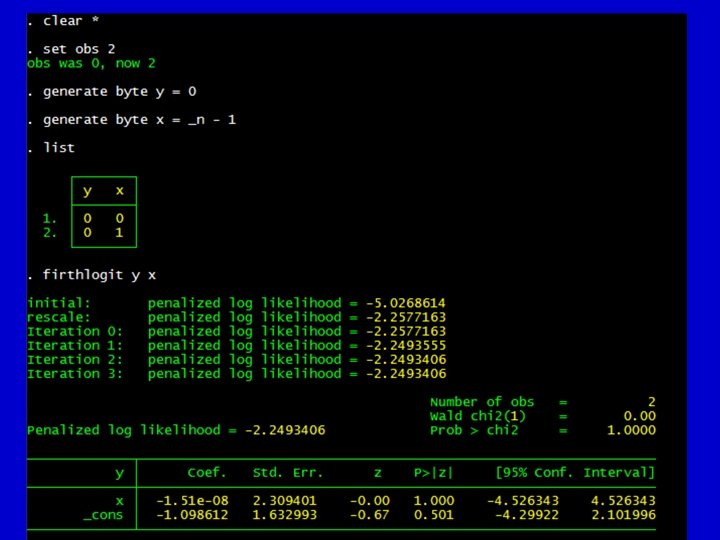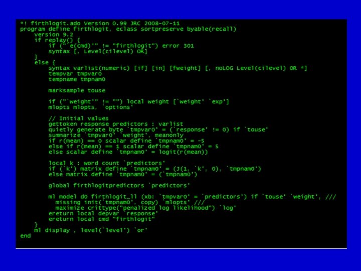Topics • • • Separation in Logistic Regression Approaches to Separation Firth’s Bias-reduced GLMs firthlogit: syntax and examples Caveats and to-do’s