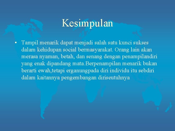 Kesimpulan • Tampil menarik dapat menjadi salah satu kunci sukses dalam kehidupan social bermasyarakat. Orang lain akan merasa nyaman, betah, dan senang dengan penampilandiri yang enak dipandang mata. Berpenampilan menarik bukan berarti ewah, tetapi erganungpada diri individu itu sebdiri dalam kaitannya pengembangan diriseutuhnya
