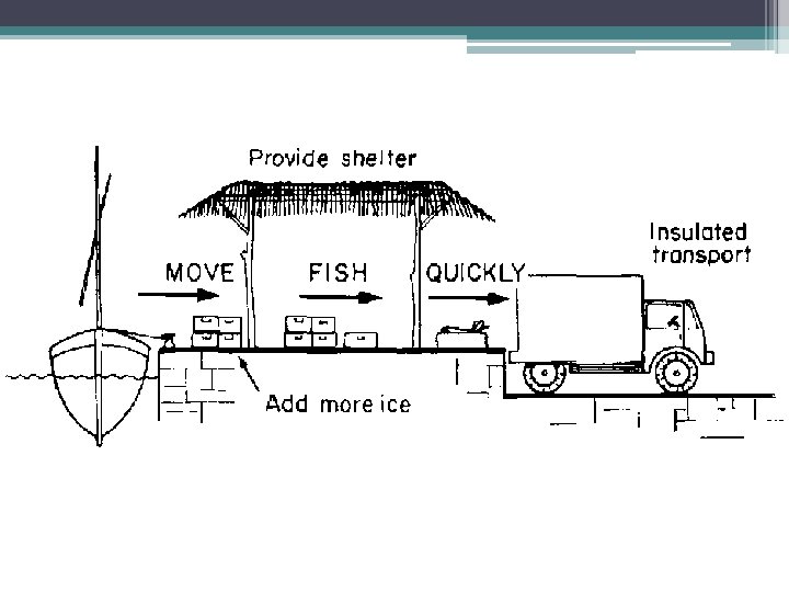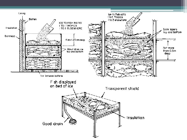 Tahapan Penanganan Ikan -. Ikan diangkat dari air -. Keluarkan ikan dari alat tangkap -. Lakukan penyiangan pada ikan -. Lakukan pencucian dengan air dingin pada ikan -. Tempatkan ikan pada wadah berisi es berdasarkan jenis, ukuran, dan mutunya -. Simpan wadah berisi ekan tersebut ke dalam palka yang sudah dilapisi es curai