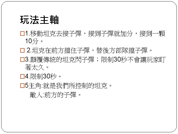 主角或敵人動作動態 � for event in pygame. event. get(): � if event. type == pygame. QUIT: � exit() #按跳出就停止 � if event. type == USEREVENT+1: � time -= 1 #讓時間倒數 � � � pressed_keys = pygame. key. get_pressed() #使用鍵盤 控制左右移動 � if pressed_keys[K_LEFT]and k. rect. x>=0: � k. rect. x =k. rect. x-10 � elif pressed_keys[K_RIGHT]and k. rect. x<=330: � k. rect. x =k. rect. x+10