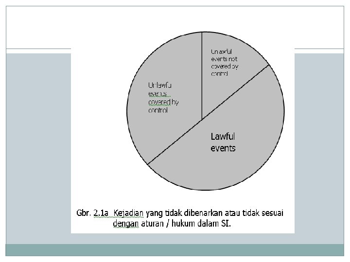 Definisi Kendali (Control) � a system that prevents, detects, or corects unlawful events. 1. A system : komponen-komponen yang saling berkaitan untuk mencapai tujuan bersama Evaluasi terhadap kontrol harus mempertimbangkan keterkaitannya dari perspektif sistem (= IS / organization perspective) 2. Focus on unlawful events (=kejadian tdk sah/tdk benar). Unlawful events : unauthorized, inaccurate, incomplete, redundant, ineffective, or inefficient input enters the system 3. Controls are used to unlawful events. prevent, detect, or correct Untuk mengurangi kerugian yang mungkin terjadi karena kemunculan unlawful events dalam sistem.