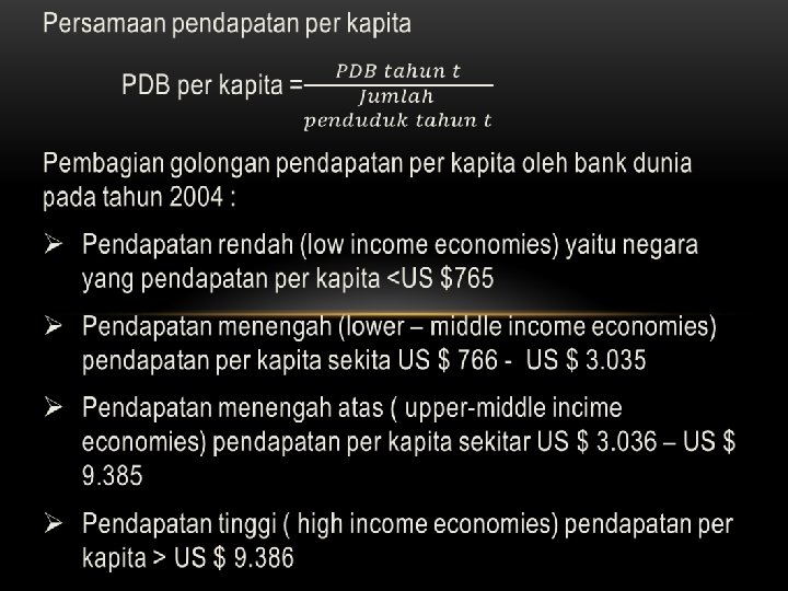 PENDAPATAN PER KAPITA Manfaat perhitungan pendapatan per kapita : 1. Mengetahui perbandingan kesejahtraan masyarakat suatu negara dari tahun ke tahun 2. Mengetahui data-data perbandingan tingkat kesejahtraan penduduk suatu negara dengan negara lain 3. Pedoman evaluasi kebijakan dalam bidang ekonomi 4. Bahan perencanaan pembangunan di masa yang akan datang 5. Membandingkan standar hidup beberapa negara dalam kelompok rendah, menengah, dan tinggi