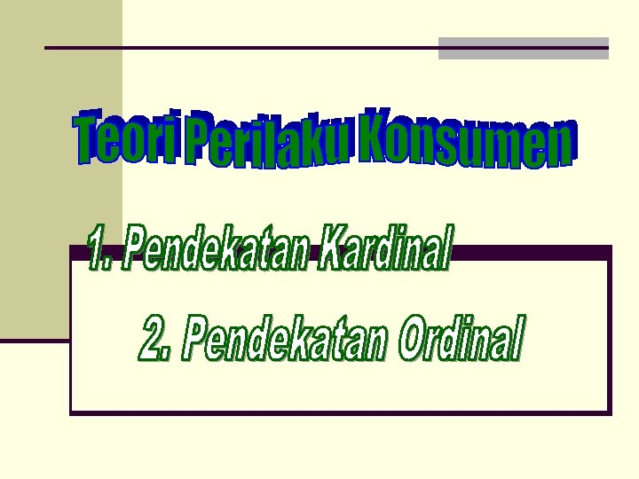 Pendekatan Kardinal Asumsi: Kepuasan konsumen bisa diukur secara kardinal Berlaku: the law of diminishing marginal utility Konsumen menggunakan seluruh anggaran yang dimiliki Konsumen berusaha mencapai kepuasan maksimum