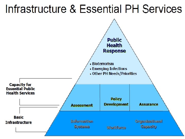 The Ten Essential Services Monitor health status Diagnose and investigate health problems Inform and educate Mobilize communities to address health problems Develop policies and plans Enforce laws and regulations Link people to needed health services Assure a competent health services workforce Evaluate health services Conduct research for new innovations
