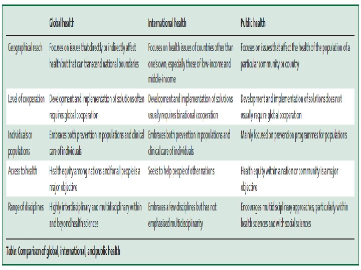TO BE REMEMBERED Secara khusus, definisi ini memperluas lingkup kesehatan masyarakat tradisional yang mencakup: Pemeriksaan terhadap berbagai faktor penentu kesehatan lingkungan, sosial, dan ekonomi - tidak hanya yang secara tradisional ditangani oleh kesehatan masyarakat dan pelayanan kesehatan klinis. 'Pemeriksaan terhadap berbagai intervensi untuk menangani masalah kesehatan, termasuk struktur dan fungsi sistem pemberian layanan kesehatan, ditambah peran kebijakan publik yang mempengaruhi kesehatan walaupun kesehatan bukan efek yang mereka harapkan.