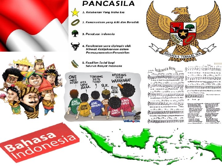 3. Identitas Nasional Indonesia a. Pancasila sebagai dasar falsafah negara Berkedudukan sebagai dasar negara dan ideologi nasional Indonesia, nilai Pancasila = jati diri bangsa b. Bahasa Indonesa, bahasa nasional, bahasa persatuan Berasal dari rumpun bahasa Melayu sebagai bahasa pergaulan dan kemudiangkat menjadi bahasa persatuan pada 28 Oktober 1928 c. Bendera Merah Putih d. Lagu Kebangsaan “Indonesia Raya” e. Lambang negara, Garuda Pancasila f. Semboyan negara, Bhineka Tunggal Ika g. Konstitusi (Hukum dasar) UUD 1945 h. Bentuk Negara Kesatuan Republik Indonesia Bentuk pemerintahan Republik, sistem politik demokrasi i. Konsepsi wawasan Nusantara j. Kebudayaan daerah