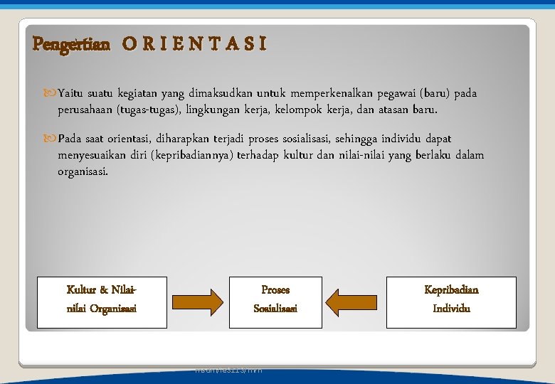 Pengertian O R I E N T A S I Yaitu suatu kegiatan yang dimaksudkan untuk memperkenalkan pegawai (baru) pada perusahaan (tugas-tugas), lingkungan kerja, kelompok kerja, dan atasan baru. Pada saat orientasi, diharapkan terjadi proses sosialisasi, sehingga individu dapat menyesuaikan diri (kepribadiannya) terhadap kultur dan nilai-nilai yang berlaku dalam organisasi. Kultur & Nilainilai Organisasi Proses Sosialisasi msdm/ie 3113/mrn Kepribadian Individu