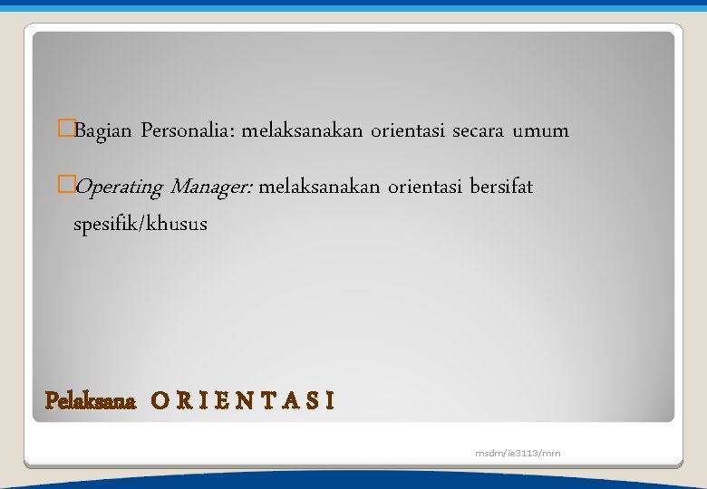 �Bagian Personalia: melaksanakan orientasi secara umum �Operating Manager: spesifik/khusus melaksanakan orientasi bersifat Pelaksana O R I E N T A S I msdm/ie 3113/mrn