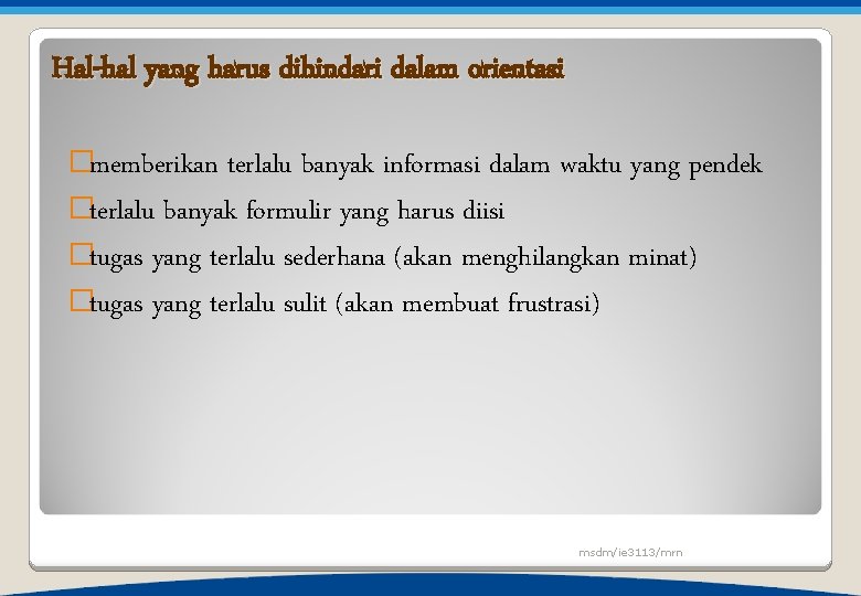 Hal-hal yang harus dihindari dalam orientasi �memberikan terlalu banyak informasi dalam waktu yang pendek �terlalu banyak formulir yang harus diisi �tugas yang terlalu sederhana (akan menghilangkan minat) �tugas yang terlalu sulit (akan membuat frustrasi) msdm/ie 3113/mrn