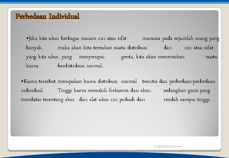 Perbedaan Individual • Jika kita ukur berbagai macam ciri atau sifat manusia pada sejumlah orang yang banyak, maka akan kita temukan suatu distribusi dari ciri atau sifat yang kita ukur, yang menyerupai genta, kita akan menemukan suatu kurva berdistribusi normal. • Kurva tersebut merupakan kurva distribusi normal teoritis dari perbedaan-perbedaan individual. Tinggi kurva mewakili frekuensi dari skor, sedangkan garis yang mendatar terentang skor dari alat ukur ciri pribadi dari rendah sampai tinggi. msdm/ie 3113/mrn