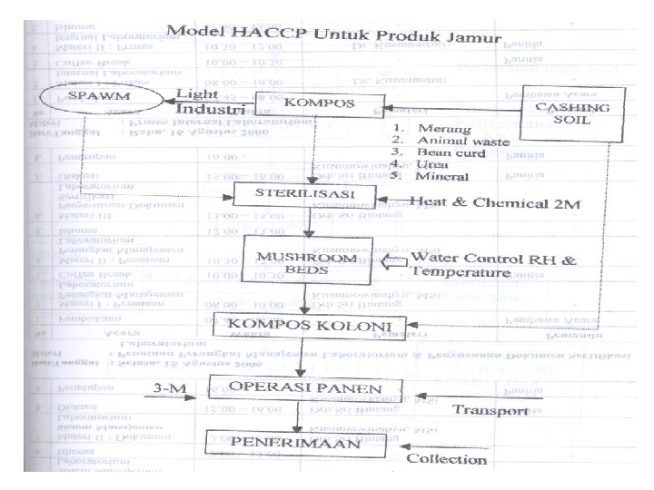 PROSES FLOW CHART Menciptakan proses Flow Chart yang akurat = Penting Critical Control Point dan batasan-batasan Contoh-contoh penerapan HACCP -Sangat berbahaya = botuksin -p. Hnya tinggi = toksin oleh Staph. Anren -Toxin = dirusak oleh panas -HACCP Model Mencegah pengembangan Enterotoxin dalam jamur segar