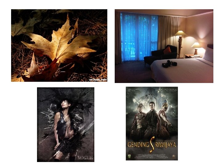 6. Gelap Terang • Gelap terang merupakan penerapan sinar atau cahaya pada obyek gambar gingga hasilnya menimbulkan kesan 3 dimensi. • Penggunaan gelap terang yang kuat akan menciptakan kesan ruang yang dalam hingga terciptanya karya tersebut berkesan 3 dimensi yang mendalam • Teknik pencahayaan pada obyek bisa dialkukan searah atau tidak searah. • Pencahayaan searah bila pencahayaannya dilakukan pada satu titik, sedangkan tidak searah dilakukan dua atau titik secara berdampigan
