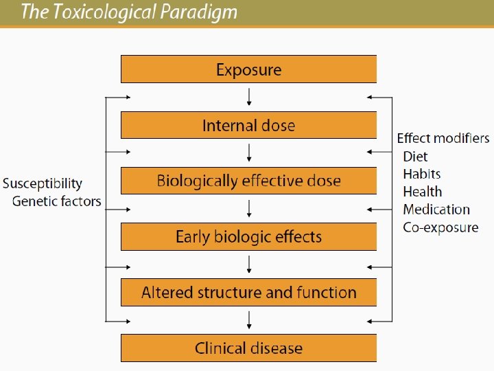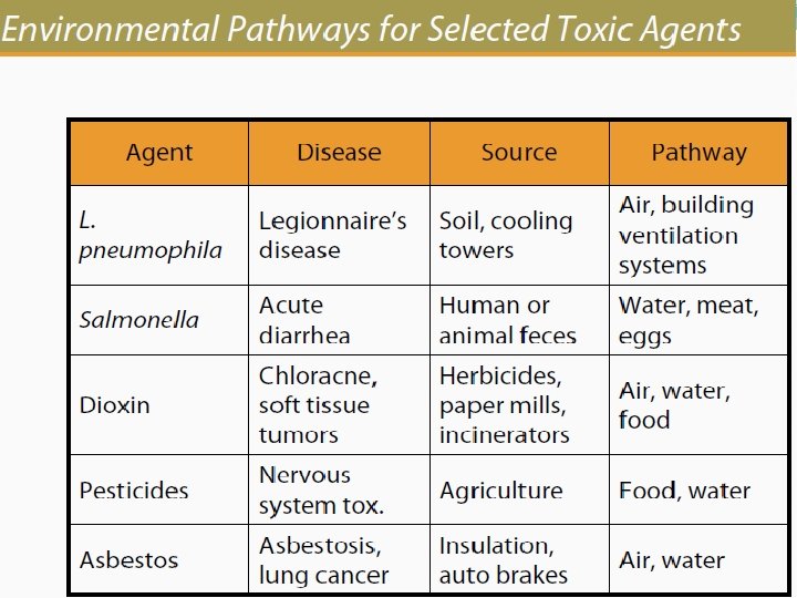 Agents and Vectors �Agents −Chemical, biological, and physical �Vectors −Water, air, soil, and food �Routes of entry −Inhalation, ingestion, absorption