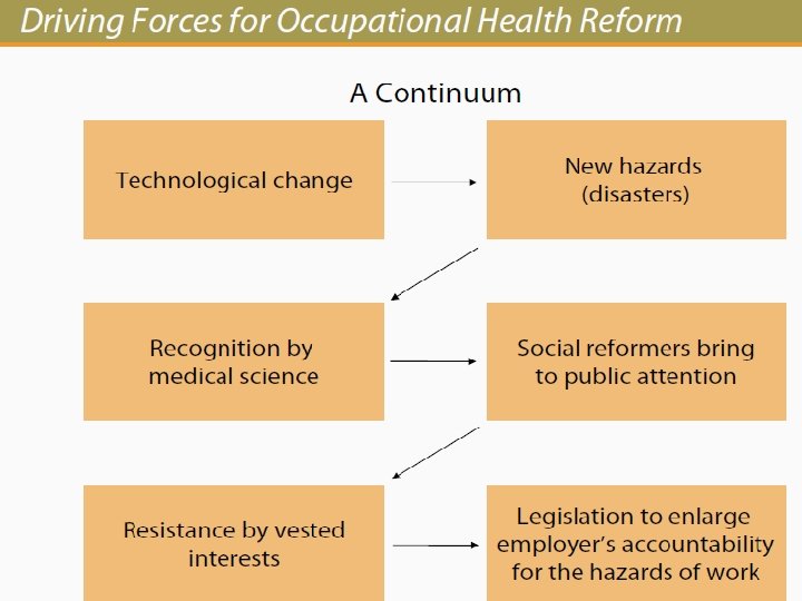 SEJARAH � Alice Hamilton : Described lead poisoning in bathtub enamelers; phossy jaw in match makers; carbon monoxide poisoning in steel workers; heart disease in munitions workers; mercury toxicity in hatters; “dead fingers”in jack hammer users; neurologic disease in viscose rayon workers; cancer after benzene exposure � Workers’compensation laws −At first, vehemently opposed and legally challenged −All states passed from 1910 to 1948 � Coal Mine Safety and Health Act, 1969 � Occupational Safety and Health Act, 1970 −Alice Hamilton dies at age 101, three months after its passage