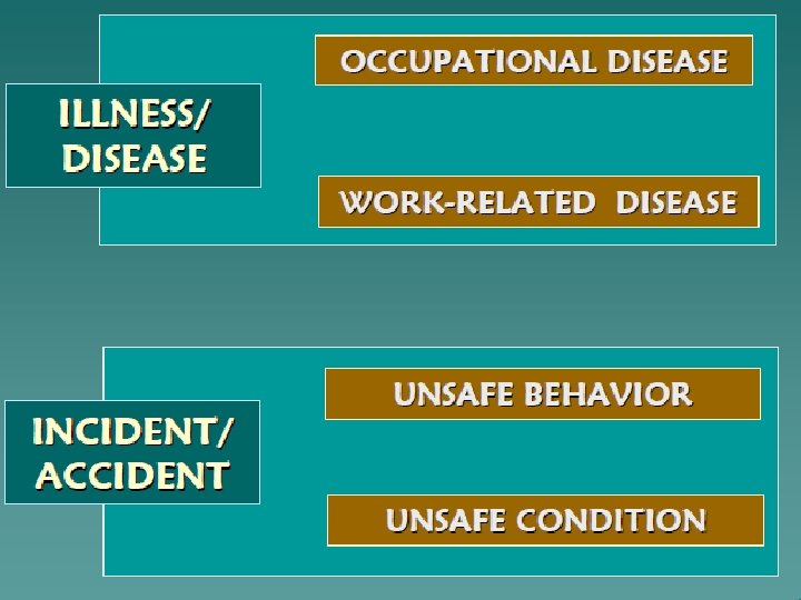 JENIS-JENIS PENYAKIT Seorang pekerja dapat mengalami berbagai penyakit : � Occupational Disease Penyakit yang disebabkan karena pekerjaannya / lingkungan kerja. Misal : keracunan Pb, asbestosis, silikosis � Work Related Disease Penyakit yang berhubungan / terkait dengan pekerjaan, namun bukan akibat karena pekerjaan. Misal : asma, TBC, hipertensi � General Disease Penyakit yang mengenai pada masyarakat umum (general disease). Misal : influenza, sakit kepala