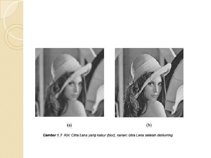 Pemugaran citra (image restoration) Operasi ini bertujuan menghilangkan/ meminimumkan cacat pada citra. Tujuan pemugaran citra hampir sama dengan operasi perbaikan citra. Bedanya, pada pemugaran citra penyebab degradasi gambar diketahui. Contoh-contoh operasi pemugaran citra: a. penghilangan kesamaran (deblurring).