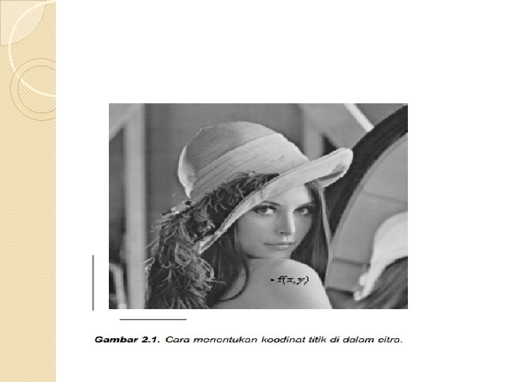 Model citra (x, y) : koordinat pada bidang dwimatra f(x, y) : intensitas cahaya (brightness) pada titik (x, y) memperlihatkan posisi koordinat pada bidang citra. Sistem koordinat yang diacu adalah sistem koordinat kartesian, yang dalam hal ini sumbu mendatar menyatakan sumbu-X, dan sumbu tegak menyatakan sumbu- Y.