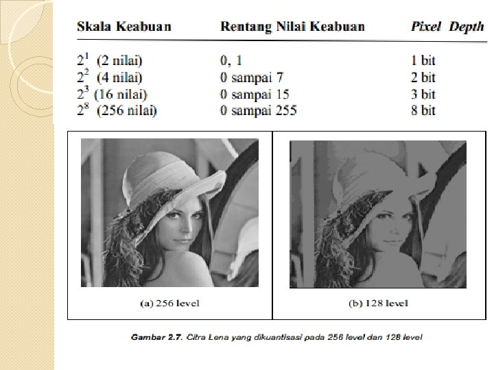 Proses kuantisasi membagi skala keabuan (0, L) menjadi G buah level yang dinyatakan dengan suatu harga bilangan bulat ( integer), biasanya G diambil perpangkatan dari 2, G= 2 m yang dalam hal ini, G= derajat keabuan m= bilangan bulat positif