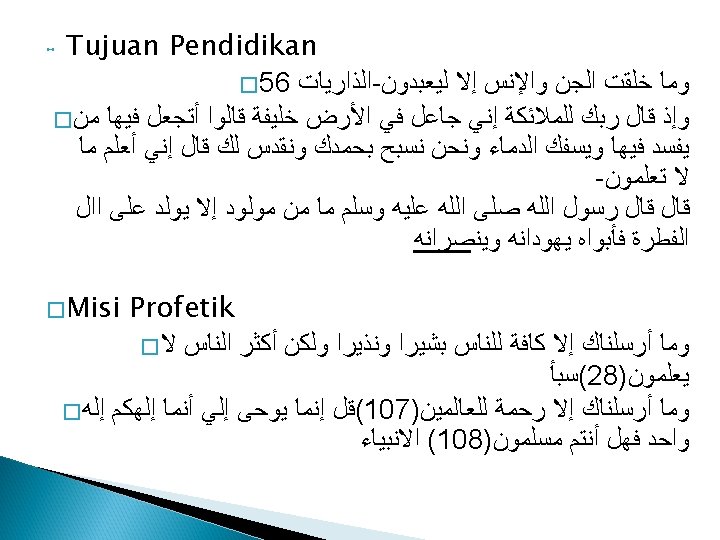 Prosedur Penafsiran � Ada dua metode a) Maudlu’i b) Tahlili � Maudhu’I, dimulai dari pembahasan tema, kemudian ayat/hadits yang terkait digunakan untuk mendasari pembahsan pada tema dan sub tema yang didiskusikan. (tema dalam perspektif al. Qur’an/Hadits) � Tahlili, dimulai dari ayat, dijelaskan maksudnya dengan memanfaatkan hadits yang terkait. Jika ada sebab nuzul atau sabab wurud bisa disertakan. Kemudian nilai yang dikandung dianalisis dari perspektif pendidikan