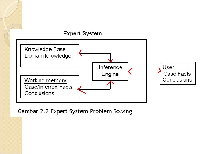 KNOWLEDGE BASE �Definisi : Bagian dari sistem pakar yang berisi domain pengetahuan �Berisi pengetahuan yang dibutuhkan untuk memahami, merumuskan dan menyelesaikan masalah. Terdiri dari 2 elemen dasar: �Fakta, situasi masalah dan teori yang terkait �Heuristik khusus atau rules, yang langsung menggunakan pengetahuan untuk menyelesaikan masalah khusus.