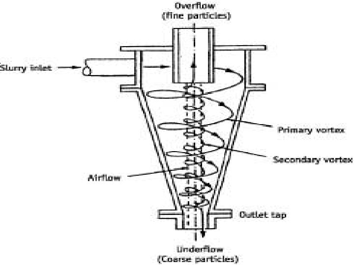 CARA KERJA • Hydrocyclone bekerja dengan cara memutar zat yang dimasukan di dalam ruang dalam yang berkontur. Material yang lebih berat dialirkan ke bawah melalui jalur spiral di sepanjang dinding ruangan, sementara material yang lebih ringan diarahkan ke ruang penampungan di bagian atas.
